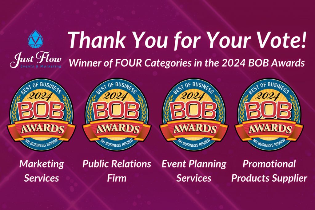 Our New Hampshire marketing agency has a long history with the BOB Awards, winning Best Marketing Services and Best Public Relations Firm every year since 2019. The introduction of Best Event Planning Services and Best Promotional Products Supplier as two new categories on the 2024 BOB Awards ballot adds a new layer to our 2024 BOB Awards win. Just Flow’s ability to excel in all areas of marketing and communications demonstrates our versatility and comprehensive approach to meeting the diverse needs of our clients.