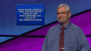 Red Arrow Diner appeared as a famous Daily Double clue worth $800 in a category titled Eastern Seaboard. The clue was timely to the upcoming Presidential Primaries: White House hopefuls visit the Red Arrow Diner in this New Hampshire city that’s on the Merrimack River. The contestant, a man named Jim-Bob Williams from St. Albans, West Virginia, gave the correct answer of Manchester.